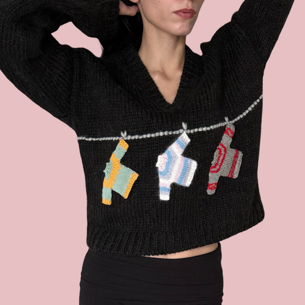 Soft hand-knitted sweater featuring small knitted mini-sweaters attached, designed to play with the idea of wool shrinkage in case of improper washing.